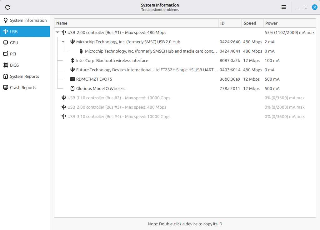 The “USB” page shows a detailed view of all plugged-in devices, including their type, name and ID (which uniquely identifies the device and its manufacturer).